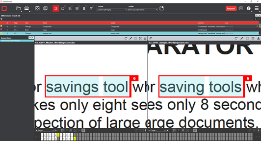 To review the difference list navigate through them using either keyboard arrows or by clicking on each difference.