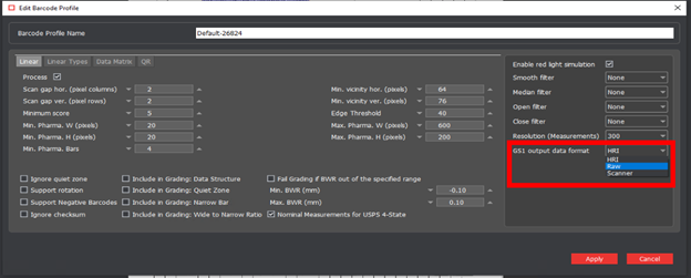 Starting with GlobalVision desktop v5.4, the barcode inspection profile contains the option of choosing which format to display the decoded GS1 barcode, these options are: