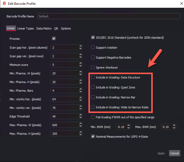 Answer: There are some settings that are not included by default in the barcode grading (See screenshot below) because according to the ISO/IEC 2016 standard, they don’t have to be.
