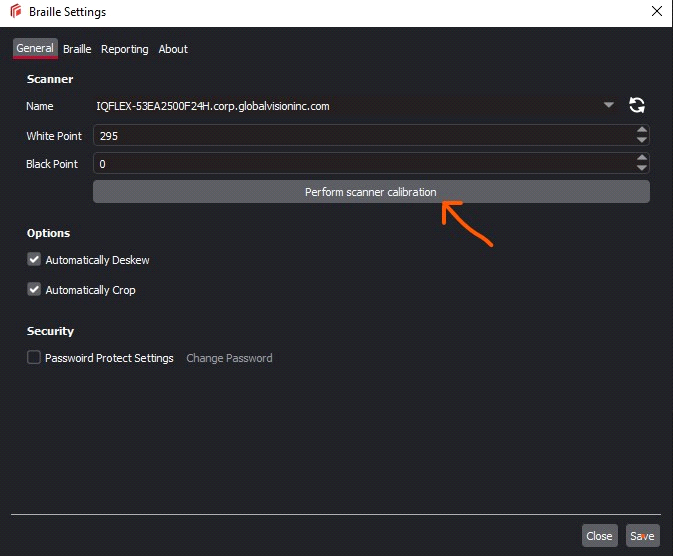 Select Scanner Settings from the menu below to open the Braille Settings window.