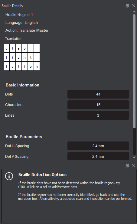 To navigate to a Braille region, click on it in the Braille panel. The Braille Details panel displays its translation and different parameters. The region itself gets highlighted in the Inspection View.