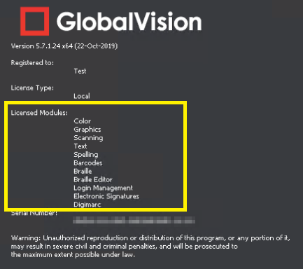 NOTE: If one of the constitutive items of a particular bundle is missing, the bundle will not appear in the ‘About’ window. An example is shown below where a license was provided with ‘Graphics’, ‘Braille’, ‘Text’ and ‘Spelling’ modules enabled but no ‘Barcode’ module. As a result of this, ‘Digital’ will not appear as a bundle.