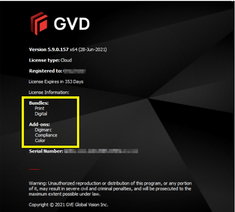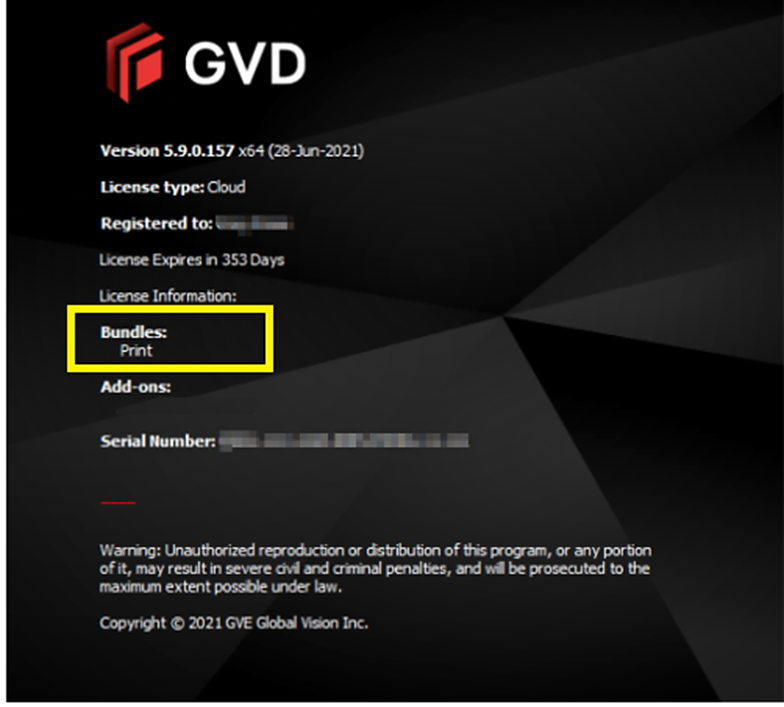 The GVD versions 5.7.1 and below had the information of all the licensed modules and or add-ons displayed on the ‘About’ window, as per the image shown below.