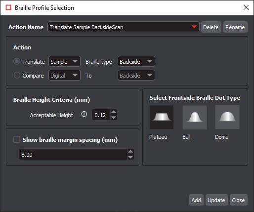 Select 'Action' as 'Sample' and Braille Type as 'Backside'