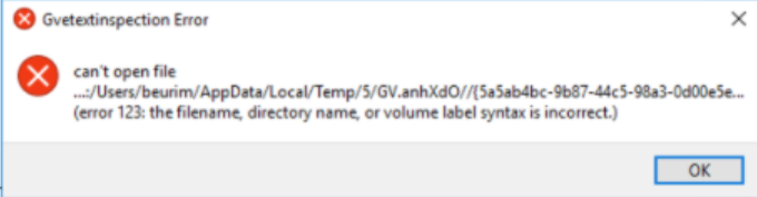 Error Message: “Gvetextinspections Error - Error 123: the filename directory name or volume label syntax is incorrect.”