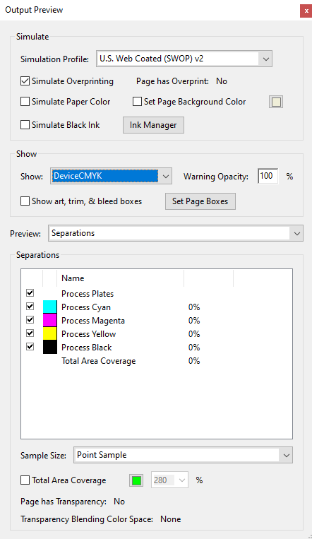 This indicates that there is perhaps a difference in the color mode used in the master and sample files. This can be confirmed by opening the files in Adobe Acrobat Pro DC and navigating to Print Production → Output Overview:
