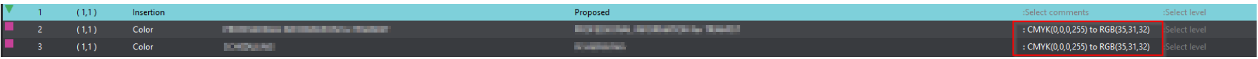 In some cases, there is no real difference in font color, but when further analyzing the differences list in the text inspection, it appears the colors change from CMYK to RBG (See screenshot below):