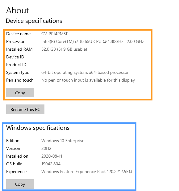A new window will open providing you device specifications as well as the version of Windows being run