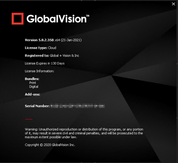 The license information will display where 0 means that the seat/add-on is not enabled and 1+ means that it is enabled. Note for GVD 5.8.X, a “Seat” is equal to Digital Bundle which includes the ‘Graphics’, ‘Barcode’, ‘Braille’, ‘Text’, and ‘Spelling’ modules.