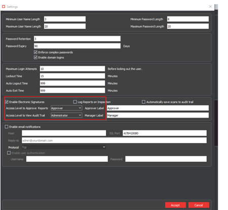 Put a checkmark on “Enable Electronic Signature” and Access Level to Approve reports is set to Approver and seen below and click on Accept.