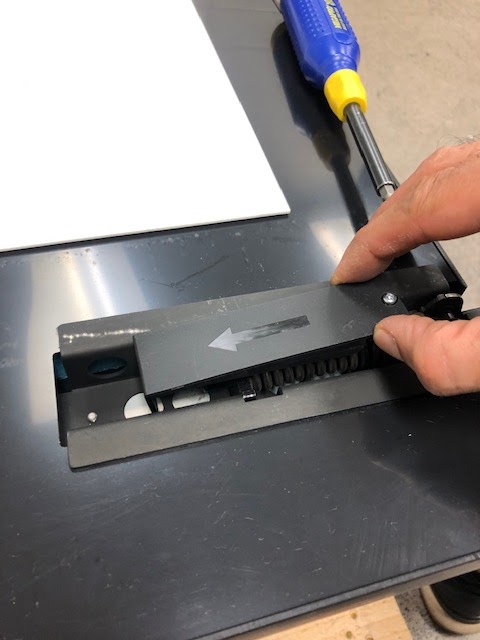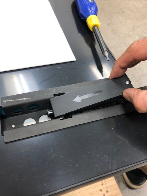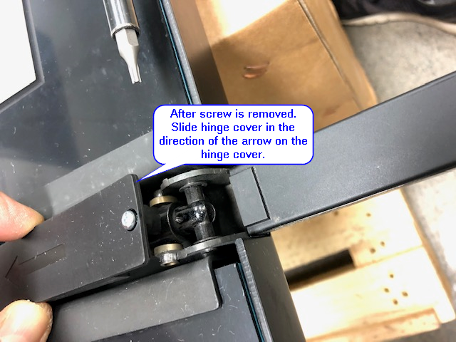 3. After the screw is removed. Slide-out the hinge cover in the direction of the arrow on the hinge cover: