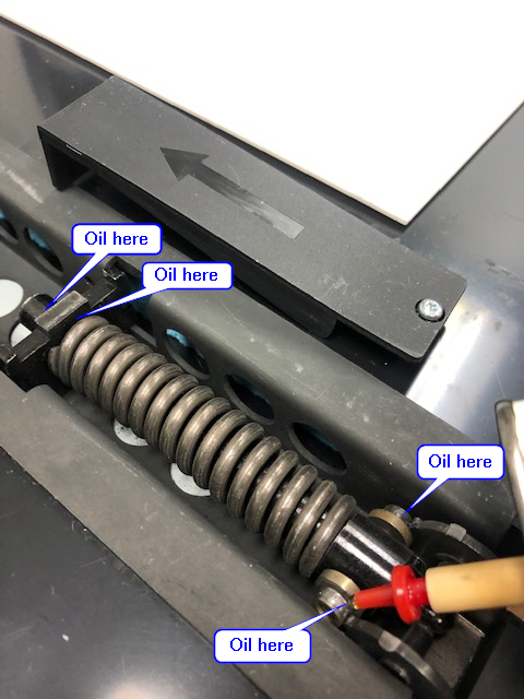 8. Apply 1-2 drops of oil on the four locations on the hinge: