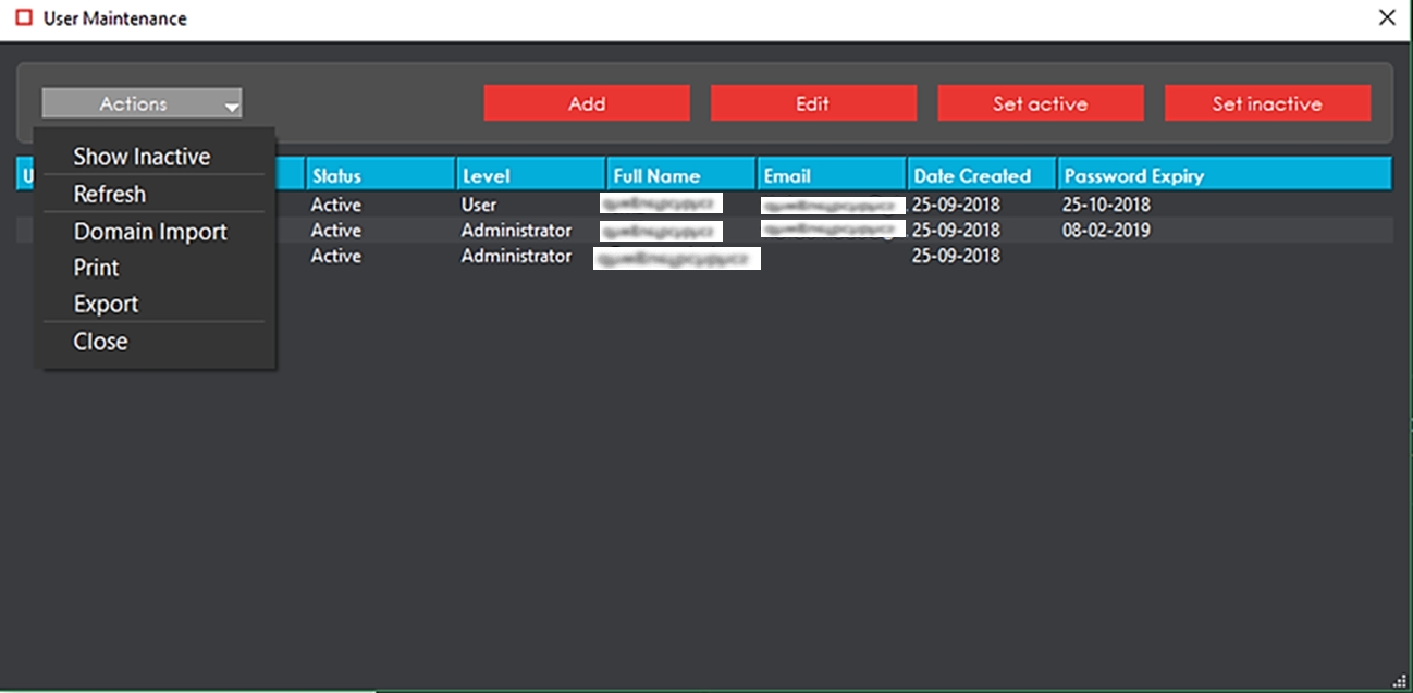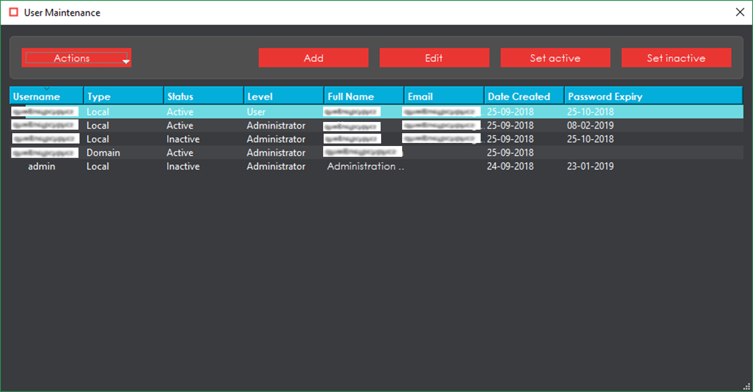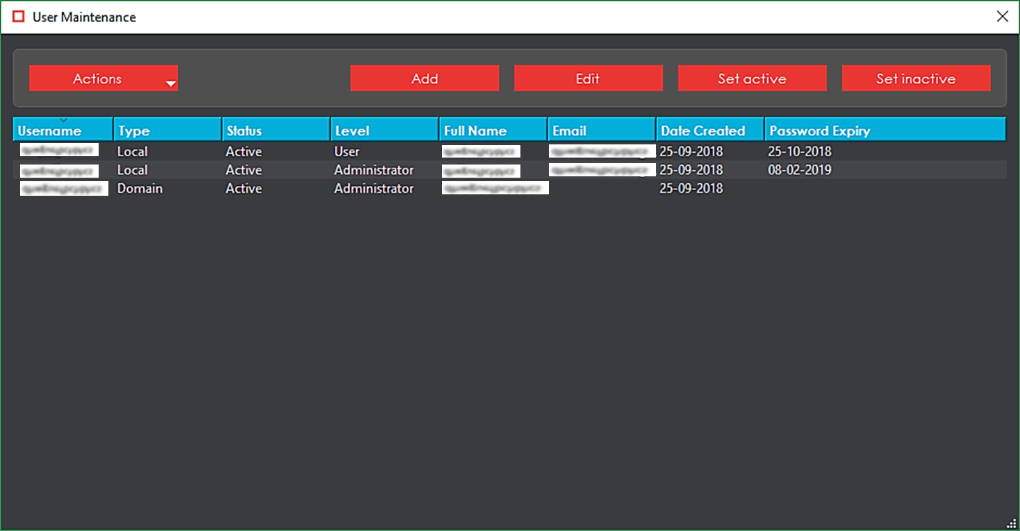 The ‘User Maintenance’ window would now be updated to show both the active and inactive accounts, as shown in the image below.