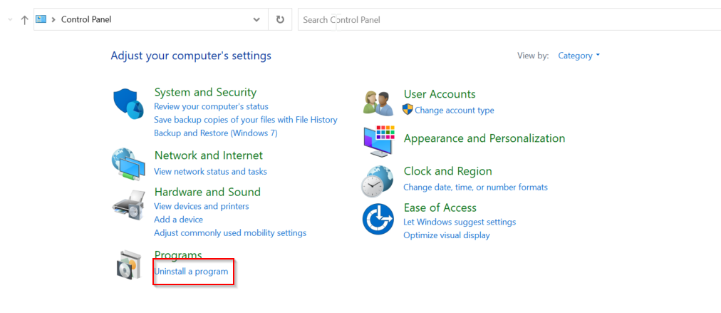 -Click “Uninstall a program” as seen below: