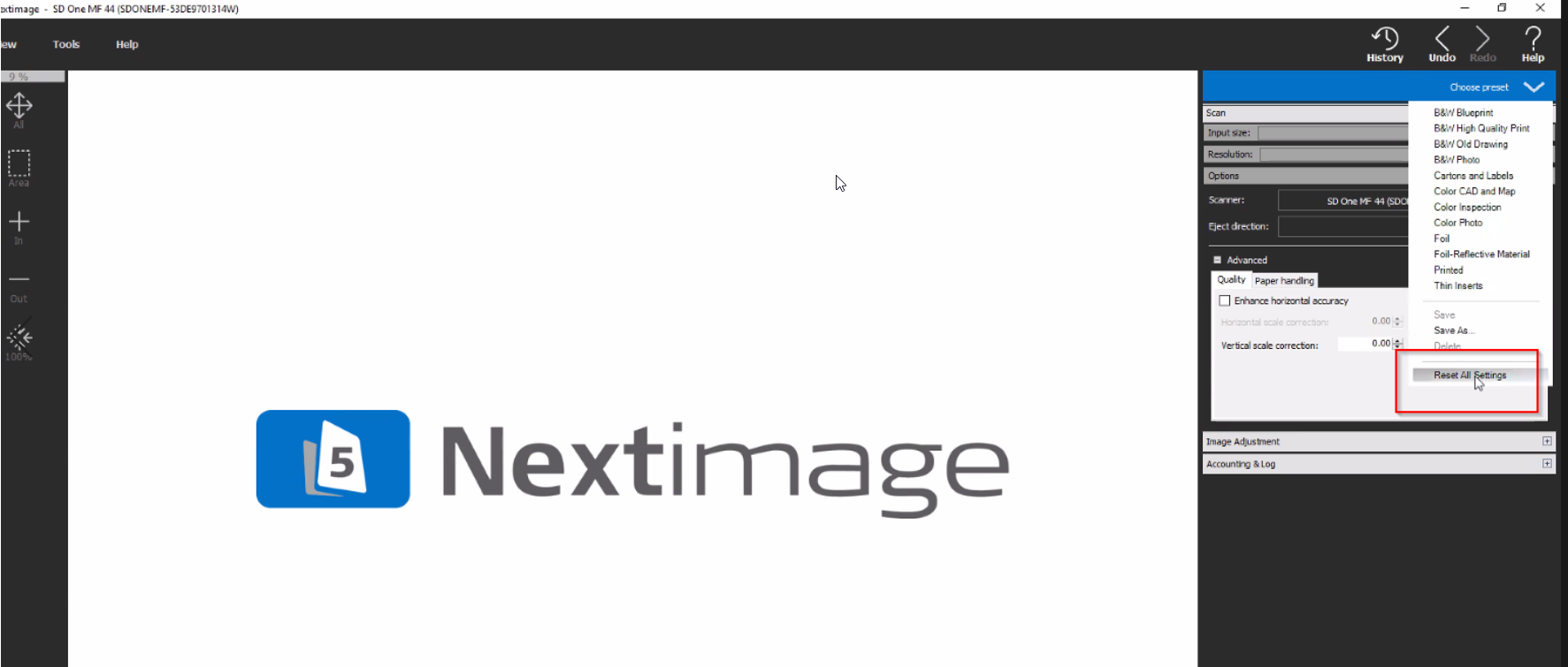 Open NextImage and select “Reset All Settings” under “Choose preset”. Keep in mind this will reset all the settings to default settings.