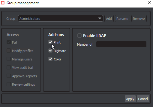 In the “Group management” window, ensure that the print option is enabled for the corresponding group (In the image below, we need to ensure that “Administrators” have access to Print):