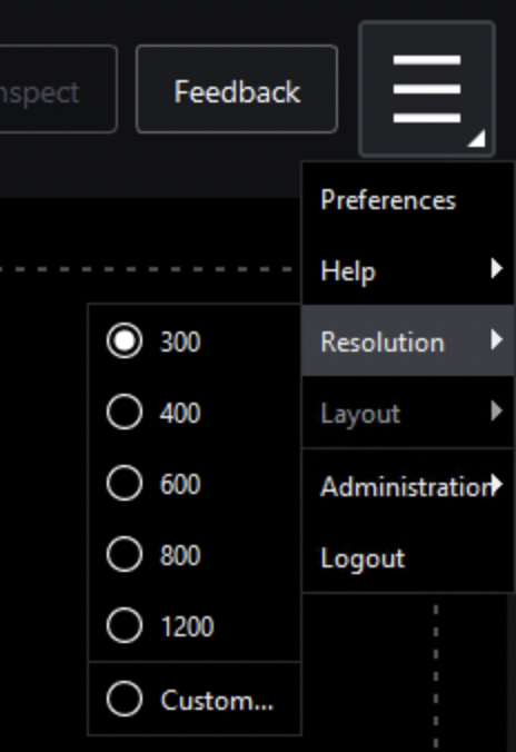 Click on Menu → then Resolution. Choose between the options available (DPI: 300, 400, 600, 800, 1200, or Custom.)