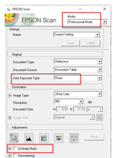 In the “Epson Scan” window, we need to have the following settings