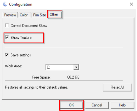 4. Click on Configuration → Other → Check 'Show Texture' option. (Each time you scan, this option has to be checked manually).