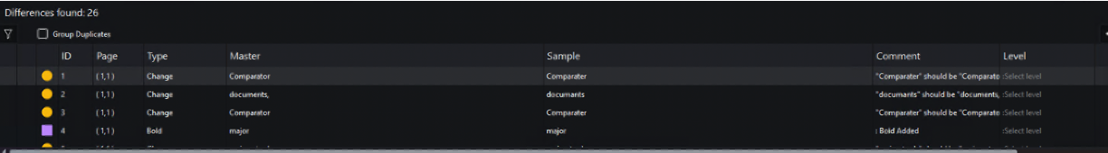 To group duplicated differences, Select the Group Duplicates option on the Top-left of the Differences panel.