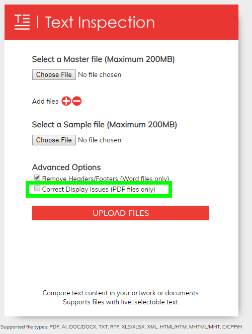Correct Display issues is used to corrects issues such as corrupted fonts that may exist in a PDF file due to the way the file was created and can be found at the file load page.