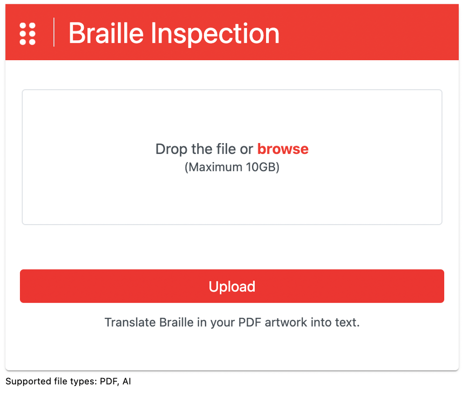 Click the Drop the file or browse button to select and upload the file with Braille to translate.