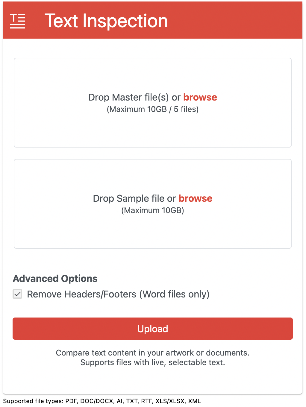 Click the Drop Master File or browse button to select and upload the Master file you would like to compare. Alternatively, you can drag and drop the desired file.