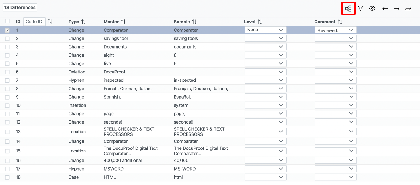 Grouping provides a possibility to group all similar differences, as such making proofing more efficient for the user. This functionality aims at increasing user experience with faster inspection analysis. Clicking this icon will remove identical differences from the list, as such, they do not need to be analyzed individually.