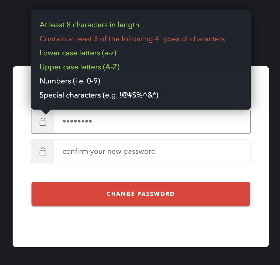 The password criteria check will pop up while inputting a new password. This is to help users set an approved new password.