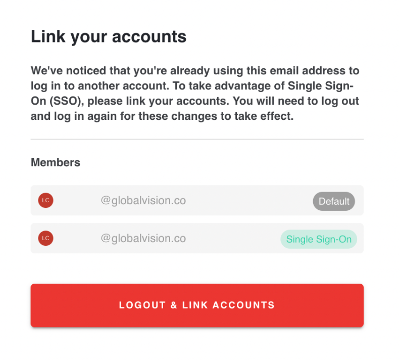 It is possible to link an existing default, user-password-based account to a Single Sign-On account when the latter is enabled on that specific account. The user needs to click on the Logout & Link Accounts button to link the accounts.