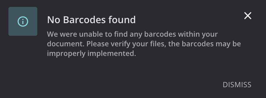 If no barcodes are detected on your files, a popup window will appear on the screen saying “No Barcodes found“.