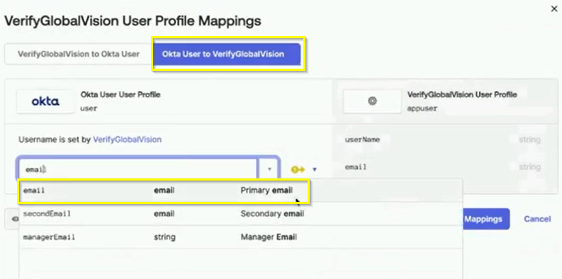 Okta User to InsertAppNameand then click on the dropdown menu and selectemail.